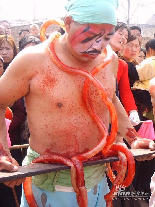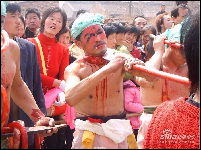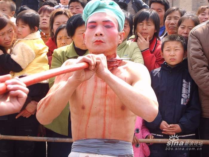 血故事大约在二月二龙抬头前后表演,表演的村子,总是遮遮掩掩,莫敢大张旗鼓,这样不知怎么也吸引了很多邻村外乡的人们驱车观看(我得到消息,赶到已经快12点钟了,高潮已过)。