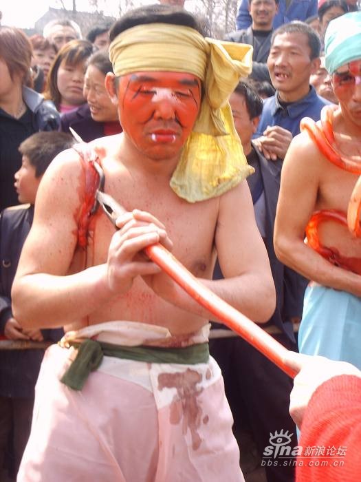 血故事,有严格的规定,严禁拍摄化妆、卸装场面。从村子人口中得知,他们大致多用家畜的血或者红的颜料涂抹在身上,用上特制的道具,跟魔术似的,如叉脖子、刺眼、断臂、刀劈脸,一般不得而知,逼真生动,又给故事平添了几分神秘色彩。
