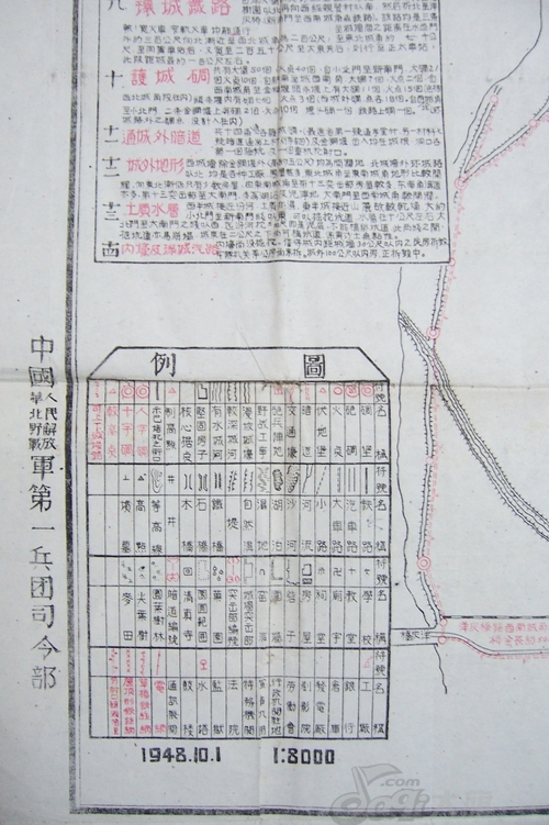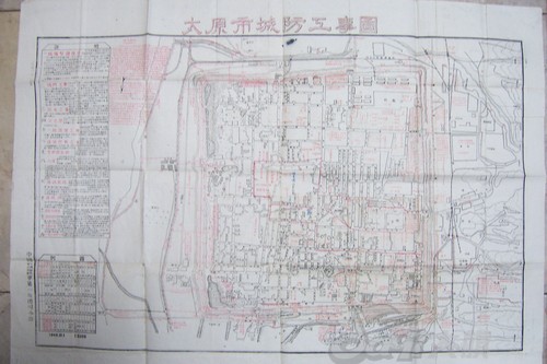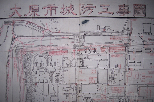 抖开了《太原市城防工事图》,油印的。看好了,1948年10月1日,中国人民解放军第一兵团司令部印制的。这位说这是什么日子?离开国大典整一年,那边的辽沈战役正要开始,林彪正那儿犹豫着要不要听西柏坡的指挥先打锦州;淮海战役还得半年以后开打,平津傅作义这里也还没明白共军下一步要干什么;徐向前已经在山西把太原城给围住了(关于太原战役详细情况,可参阅本站《太原沧桑》栏目第三十章《太原战役》)。