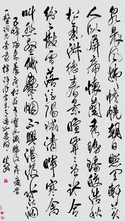 有幸多次观赏到这样的巨制作品,不仅让笔者感慨万千,也让笔者对傅山的书法创作理念与艺术成就有了更加真切的认识。众所周知,傅山不仅是一位闻名遐迩的大书法家,同时又是一位魄力非凡的书法理论家。他提出的“四宁四毋”(即宁拙毋巧,宁丑毋媚,宁支离毋轻滑,宁真率毋安排)的书法理念在中国书法史上影响极大。遗憾的是,这种可贵的书法变革理念却被严重地滥用了,加之傅山本人书法面目极其多样,其中不乏率意或散漫的作品,甚至也有请人代笔或“一无可观”之作,这又为一些人胡乱曲解傅山书法理念找到了“依据”,于是乎“四宁四毋”成为不少人胡涂乱抹、肆意妄为的“遮羞布”。这不免引起书法认知与创作上的困惑:究竟什么才是傅山的“真面目”?什么才是中国书法的精髓?欣赏傅山这样杰出的作品会让我们豁然开朗:笔墨功力与艺术素养正是中国书法的“内在元气”与“精神中枢”,除掉了这种“内在元气”与“精神中枢”,中国书法就成为僵尸与“鬼画符”。试想:那些缺乏起码笔墨功力与艺术素养的所谓“书法作品”岂有艺术价值可言!更应明确的是,即使是同一位书法家的作品,也有精品与应酬之作的区别,况且每一位书法家都不是天生的,都有一个艺术上艰难的蜕变过程以及现实生活的困扰。那么,我们所珍爱、继承乃至大力弘扬的应该是书法家们所留下的精品与经意之作——那些真正代表了书家书法创作理想与艺术造诣的伟大作品。