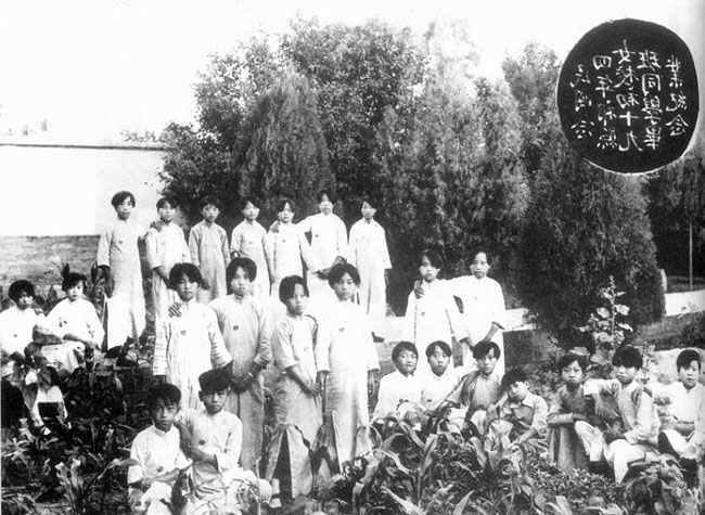 图二和图三分别是1930年和1934年两批毕业生的合影。和图一比较,照片上多了不少男性,他们分别是当时的县长、教育局官员,还有校长李得贤和教员们。别小看这种变化,这至少意味着,人们对女校开始宽容起来,对男老师进女校也不大在意了。中式旗袍是当时的时尚。这种由满汉服装相互融合、改良而成的新式旗袍早在上世纪20年代就大行其道,这时也进入山西的校园。