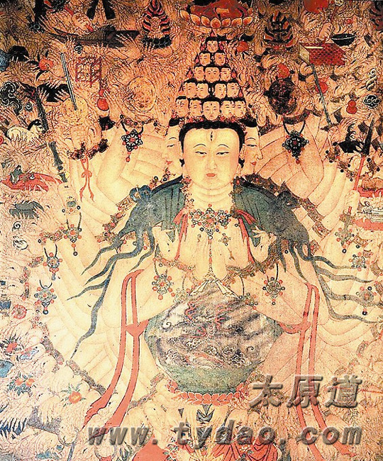 千手千眼十一面观音像高达4.68米,几乎布满了南壁西侧的整个墙壁,是寺内最精美的形象之一。观音菩萨面形圆润慈祥,除头部两侧有两面外,头上顶有五层佛头,形如花冠,顶层云气中托有一个莲台,弥陀佛端坐其中,表现了西方教主的庄严。身上置有各种飘带,镶有各种宝石和璎珞,华美而高贵。胸前有六臂,拱手合掌,腹前十八条臂膀,身后手臂更多,每只手心中各有一眼,而且手执各种法器,垒置起来有四五层之多,总计约有九百余只,形成一个巨大的扇面,从不同的角度注视着古往今来的参拜者。绘制千手千眼观音像,由于手臂众多,极易混乱,但这尊像却绘制得井井有条,不能不令八百年后的今人叹服。
