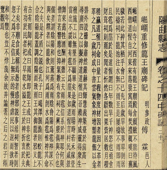 这块古碑是由傅山的祖父傅霖撰文,叔祖父傅震书丹,叔祖父傅霈篆额,兄弟三人合作完成的一块古碑。古碑的发现。具有重要的文物历史价值:它是在傅山故里发现的、在同一块石碑上由傅山祖父傅霖、傅震、傅霈兄弟三人合作的唯一古碑,也是在傅山故里发现有傅震书法的唯一墨迹,康熙《阳曲县志·卷十四碑记》题为《崛(山围)重修龙王庙碑记》,古碑题为“山龙王庙记”。题目的第一个(崛)字缺失。古碑正文原有420个字,发现的残碑尚有357个字,缺失63个字。碑额篆文全部毁坏。
