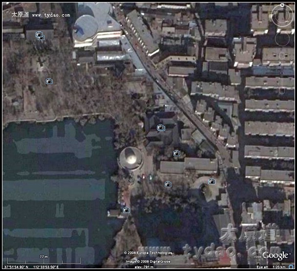 “万字楼”卫星地图,拍摄于儿童公园整修之前,上图中万字楼周边的建筑已经被拆除 |