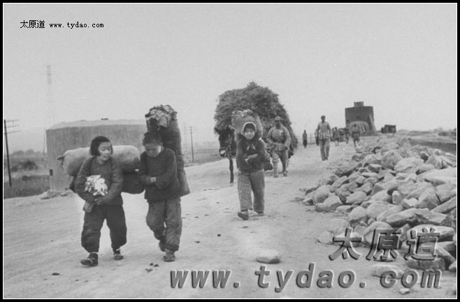 太原郊外运送食品的市民,道路两侧是林立的碉堡
