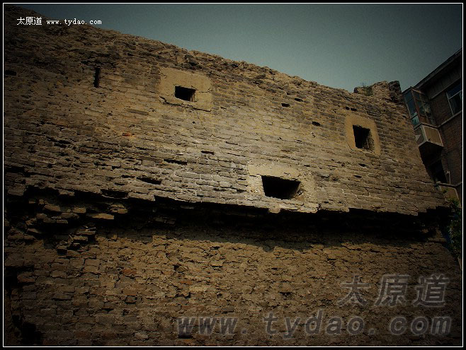 走入龙潭公园一个僻静的院落,几间低矮的平房背后,隐藏着太原旧城墙西北角羸老的躯体,披坚执锐的往昔已被雨打风吹去,城墙的包砖成片的脱落,有些地方甚至已经裸露出夯土,但是,班驳的青砖和黑洞洞的机枪射口依然显示着它的冷酷与威严。沿着荒草丛生的土坡,可以爬上城墙顶端。城角上的角楼已经不复存在,只剩下与城墙浑然一体的砖砌环型工事。从城墙顶端东侧的豁口,可以深入城防工事的内部。顶层以下的工事,是掏挖城墙的夯土而成,每层工事之间,用钢筋混凝土预制板分隔。这些工事空间虽然不大,但足够士兵们作战起居并设置机枪射口。虽然因为砖石淤塞而难以继续深入,可以确定的是这一带的工事绝不止目前可见的三层。据童年时代经常在这里玩耍的当地居民回忆,在城墙底部,还修建有深不可测的地道。 |