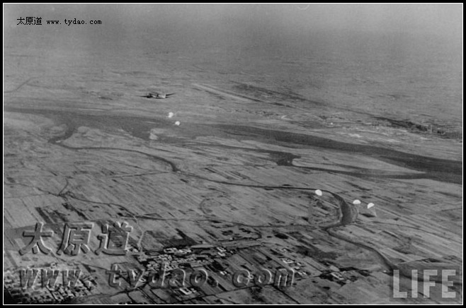 正在向太原空投给养的飞机,一个个白色降落伞徐徐下降,远处是汾河