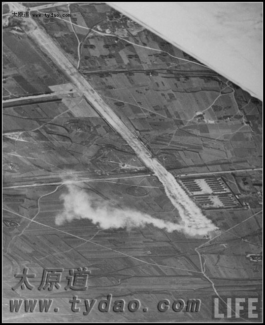 一架C-47运输机飞离烟尘滚滚的河西简易机场