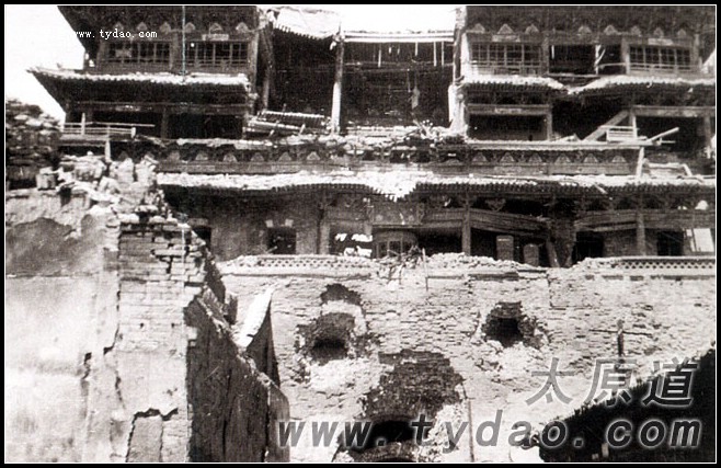被炮火击中的太原鼓楼 |