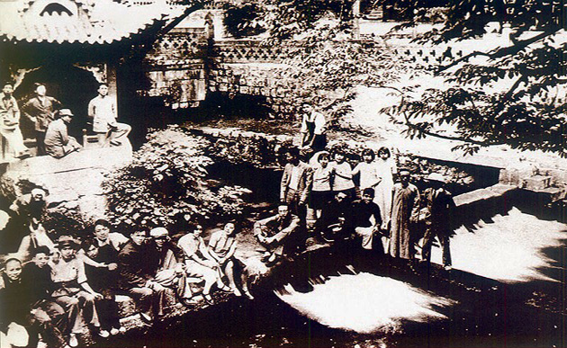 1937年6月,牺盟总会工作人员在太原晋祠合影,亭内右一为薄一波 |