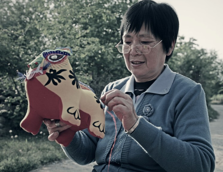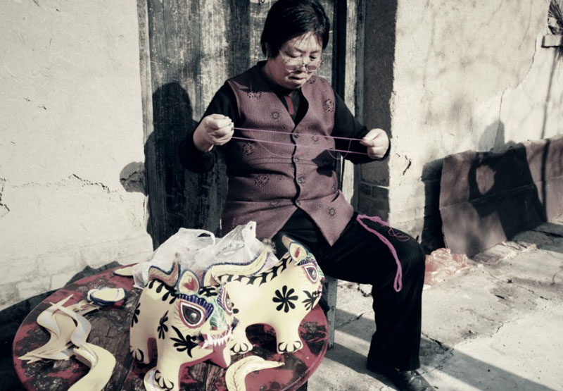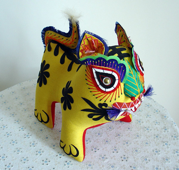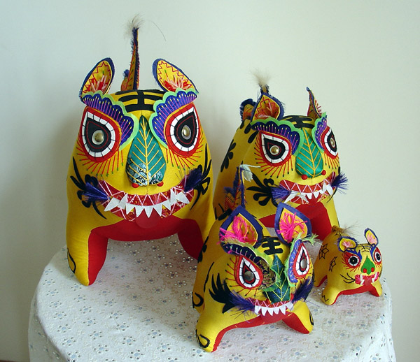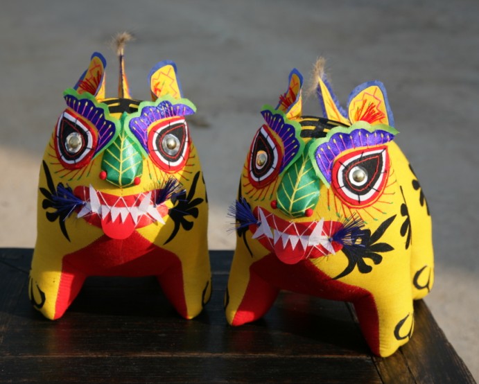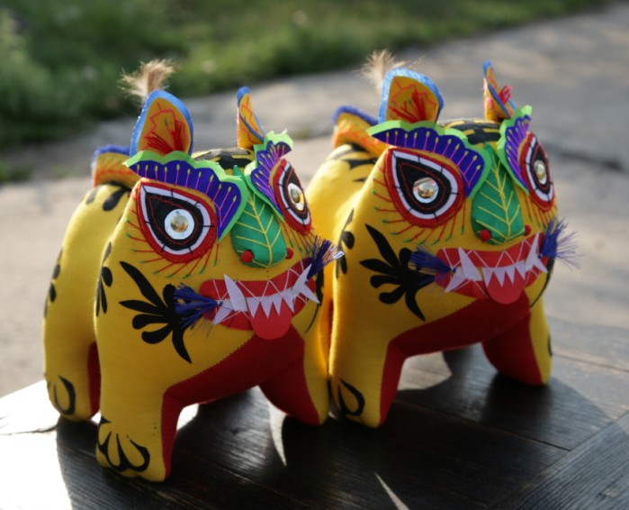 我省黎城县古称黎侯国,商周时期,“虎”是黎城境域的图腾,从黎城西关村出土的西周古墓可以证实,虎形器在当时民众的日常生活以及祭祀、军事活动中都占有重要地位,是当时社会风俗与精神信仰的重要特征。黎城民间虎形器形态多样,从材质和制作上区分,有玉石、草编、剪纸、根雕、刺绣等多个类别。但是,最具有代表性、最富文化传统价值的当数布艺黎侯虎。黎侯虎布艺制作源于黎城县赵家山村谷驼一带,后发展到黄崖洞、东阳关、停河铺等地。 1 制作工艺 “黎侯虎”制作工艺主要分六个步骤:选择代表喜庆、吉祥的红黄两种颜色的布料;将虎身的两大块布料和虎身花纹裁剪备用,剪的时候要精剪细裁,不能有丝毫的差错;将虎身两大块布缝得严严实实,有了那种虎虎生威的精神劲;再往虎身内填充木屑使之成形,填的时候要捣实,使虎有了性格,有了一种王者气度;将黎侯虎的眼、眉、耳等部位绣制好,尤其是用蓝缎缝制眉目,代表着虎的怒点。虎体纹饰是旋风图案,有“三、六、九”之分,取平平安安、顺顺当当之意;最后将事先裁剪好的花纹粘贴于虎身,再将事先绣制好的眼、眉、耳等缝制在相关部位,就完成了一件布艺黎侯虎。 2 特点 “黎侯虎”肢体造型粗、短、胖,表现了敦厚、健壮的形态;四足微微外撇,呈扎地生根状;头微昂,从态势上塑造了虎虎生威的精神劲和孩子般的天真可爱味道;黎侯虎无尖角、硬刺,突出了团块美,符合民间玩具共有的造型法则,显现出一种简约美和质朴美。虎体前后两朵略带旋风状花纹,表示了动物皮毛生成的规律;在色彩上,外表用黄色棉布作底色,奠定了老虎的基本色调,腹颔配以红布,增添了吉祥与喜庆之感,尤其是虎蹄足端处饰以篆书体“心”字象征性标识的形纹。黎侯虎讲究雌雄配对,雌雄的区别在于虎脊的纹饰。由整块布料剪成一阴一阳、阴阳相合的波纹状,分别贴于雌雄两虎背上,从而区分其雄雌性别,表达了民间传统的阴阳结合、生生不息的生殖繁育观念。 黎侯虎最基本的一个特点是重神似而不求形似,用抽象的表现反映其本质的、内在的精神状态。“黎侯虎”五官形制特殊,眼睛以桃形为基形,选黑、白、红三色次第装饰,眼珠以金属泡盖钉镶嵌,下脸以长平针和盘针法装饰眼睫毛,眼上配以群青绸缎绪边花瓣眉,显得精神活泼。鼻子选用绿色绸子包填而成,从表面上看似一片树叶,又分明在鼻子的位置。嘴巴微张,红口白牙;虎须本是刚劲如针的,但却剪出一枝美丽的兰花,熨贴在老虎的嘴角,使本来龇牙咧嘴的凶猛之态,在这里却变为喜善之像。 3 寓意 “黎侯虎”是黎城民间手工技艺的一个缩影,集历史传说、对虎的原始崇拜、图案纹饰和所昭示的信仰与审美观念为一体,民间赋予“黎侯虎”以赐福增寿、镇宅祛邪、安家生财等民俗功效,如当地有给出生的小孩“望满月”的习俗,在满月那天,由孩子的姥姥拿上“虎”,放到小孩怀中,寓意小孩像虎一样健壮,然后小孩母亲再把“虎”放在小孩的身旁,虎头朝向小孩身体,寓意这只“虎”能护佑孩子健康成长。 4 入选生肖邮票 1997年,国家邮政部门为发行虎年生肖邮票,在全国各地征集老虎图案样品。黎城县妇女高秋英用布料缝制的“布老虎”被选送到北京参加评选,在国内众多省、市送交的30多种图案样品中,黎城的“布老虎”以极具观赏性的独特造型和富有民间色彩脱颖而出,1998年被国家邮电部选为虎年生肖邮票图案。从此,“黎侯虎”走进了千家万户。“黎侯虎”的造型、色彩赏心悦目,是一件极富文化品位的民间工艺品,“黎侯虎”的历史文化内涵与不可多得的特性,在全国近千种布老虎中显得更具收藏价值,如今集观赏、收藏、馈赠功能于一体的“黎侯虎”受到越来越多人的喜爱。 ■ |