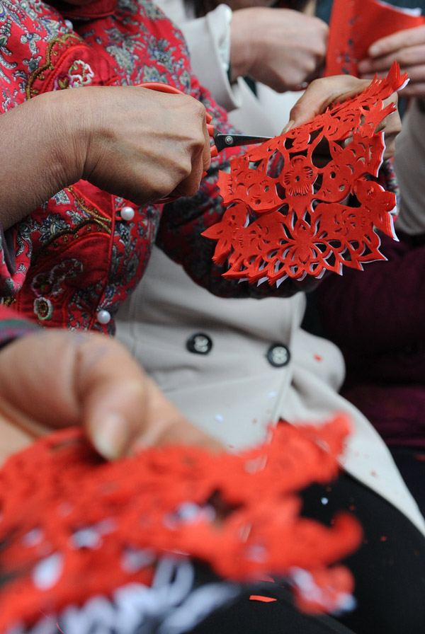 3月1日,山西省中阳县庞家会村几位民间艺人正在剪纸