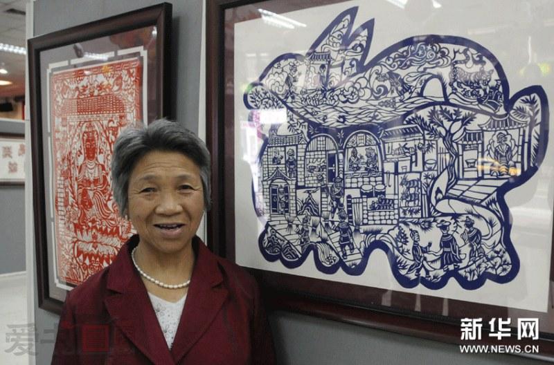 山西中阳剪纸的传承人王计汝在“山西吕梁中阳剪纸艺术展”上展示其作品