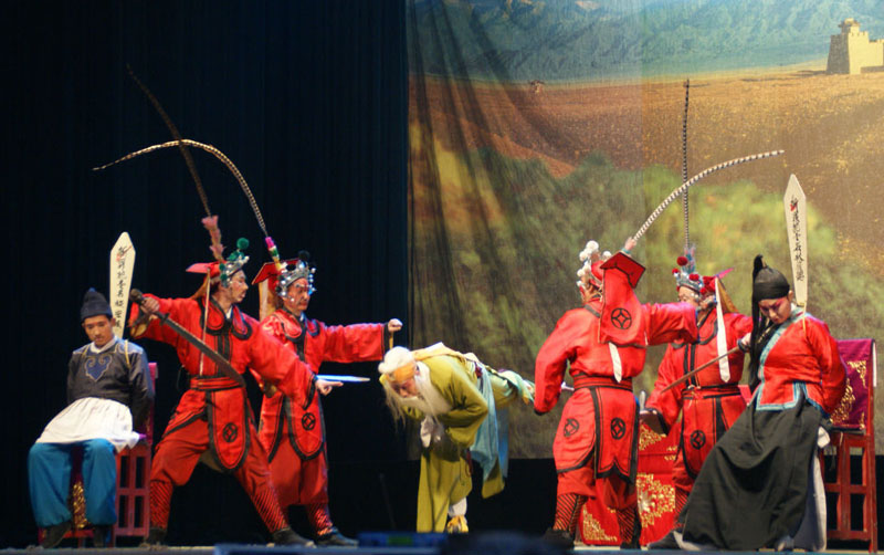 北路梆子是山西四大梆子之一,主要流行于晋北、内蒙古、陕北及张家口一带。新中国成立前,有“大戏”、“梆子戏”、“北路戏”、“代州梆子”等称谓,1954年山西省首届戏曲观摩演出大会定名为“北路梆子”。 北路梆子兴起于明末清初,形成地区以忻、代二州为中心,南起太原府,北至古长城,西跨黄河两岸,东起蔚州四围,占据着十分重要的地理位置,是黄、汾流域通向北京和口外的主要大道,官车商旅,络绎不绝。历来有重兵驻扎,五方杂处,方言交混,为本地剧种的形成和外来剧种的活动提供了有利条件。明末清初,形成于陕西同州和山西蒲州一带的以“奚琴”和梆子戏为主要乐器的“山陕梆子”开始向四面扩散传播,北路梆子就是在山陕梆子北传的基础上形成的。北路梆子的老艺人代代相传,学的是 “陕西梆子蒲州调”。它最显著的特征是以山陕梆子“花音”乱弹为基本唱腔而发展变化,扬弃其“苦音”乱弹,但保留“4”与“7”两个音作上句结尾以表现悲苦色彩。从唱腔旋律、节奏、曲体、调式等方面比较,北路梆子和同州梆子的“花音”乱弹近似,道白用“蒲白”。 清乾隆至咸丰年间为北路梆子的成熟期,其标志:一是有了本地固定班社,如大成班、吉庆班、自成班、贵林班、兴顺班等;二是有了比较丰富而完整的剧目,除保留了《打枣》、《打灶君》一类的生活小戏外,主要是反映历史生活的大戏,如《龙凤剑》、《朱仙阵》等;三是有了一些名艺人,但多以蒲州籍艺人为主;四是有了一整套完善的演出规例,每台戏一般唱三天,分别称“起日”、 “正日”、“末日”或“起唱”、“正唱”、“末唱”,每天唱日夜两场叫“两开戏”或“两开箱”。这些称呼一直沿用至今。清同治年间至抗日战争前是北路梆子的鼎盛时期。这一时期班社众多,仅在晋北忻、代二州辖境与蔚州部分舞台留下名的班社就达六十多个,据粗略统计,总数约有一百多个,它们分别活动于山西北中部、内蒙古中西部、河北西北部及陕西最北部,个别班社更远涉库伦(今蒙古国乌兰巴托)及甘肃兰州。这一时期名家众多,仅进京献艺享名的就有“十三旦”侯俊山、“十三红”孙培亭、“云遮月”刘德荣、“盖七省”董瑞喜等,本地名角更是数不胜数。抗日战争开始后,北路梆子班社基本解散,虽然晋绥根据地和内蒙古西部还有一点零星演出活动,但再无人办科班,只是由于民间“吹戏”的传承才使其唱腔得以保存下来。 北路梆子的艺术特色有三个:一是生活气息浓郁;二是语言通俗流畅;三是重唱。北路梆子的行当号称“红黑生旦丑”五大行。北路梆子的音乐包括唱腔、曲牌、锣鼓经三部分。 北路梆子现保存有传统剧目四百多个,绝大多数是表现帝王将相、忠臣义士、才子佳人、烈女节妇的。其中经整理改编的 《金水桥》于1980年由中央新闻纪录电影制片厂拍摄成戏曲艺术片,此外还有一些在省内外较有影响的剧目,如《王宝钏》、《血手印》等。北路梆子有一支行当齐全、阵容整齐的演员队伍,既有像李万林、翟效安、任建华、张秀莲等一批老一辈表演艺术家,又有杨仲义、成凤英、贾粉桃、张彩萍等一大批年轻的、多次获奖的中坚力量,在全国戏曲界影响颇大。 ■ |
