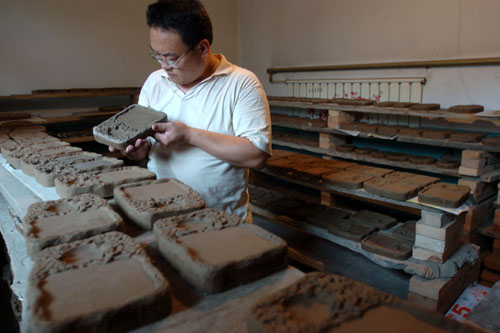 2007年7月18日,在山西省新绛县绛州澄泥砚研制所, 蔺涛正在检查砚坯,这些砚坯要进行3个月的阴干(新华社记者江宏景摄)