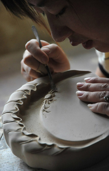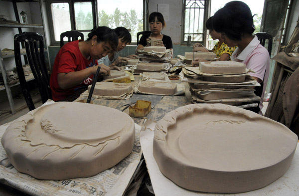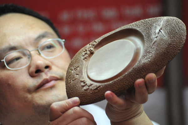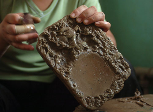 2010年7月24日,工艺师在修饰绛州澄泥砚“和谐砚”(新华社发高新生摄)