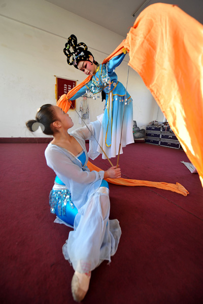 2011年3月11日,孝义木偶戏艺人在表演木偶长绸舞《霜月婵娟》(图一至图七由詹彦拍摄)