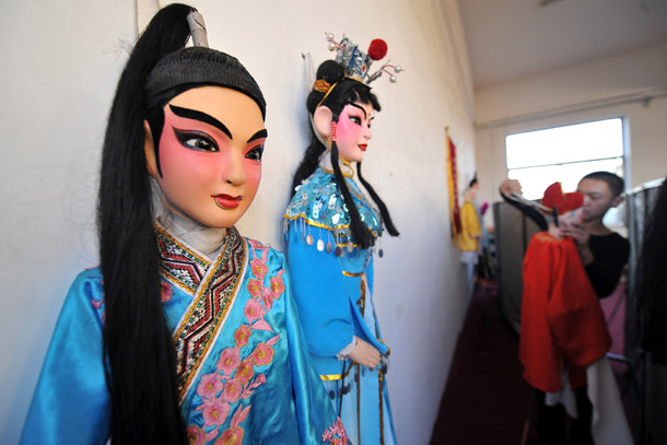 孝义木偶戏艺人在整理演出道具