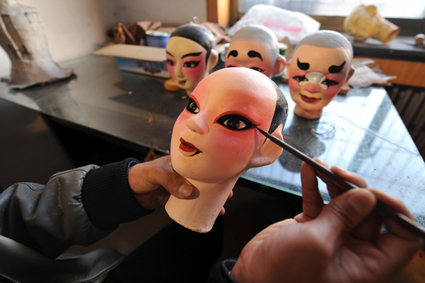 孝义木偶戏艺人在给木偶上色