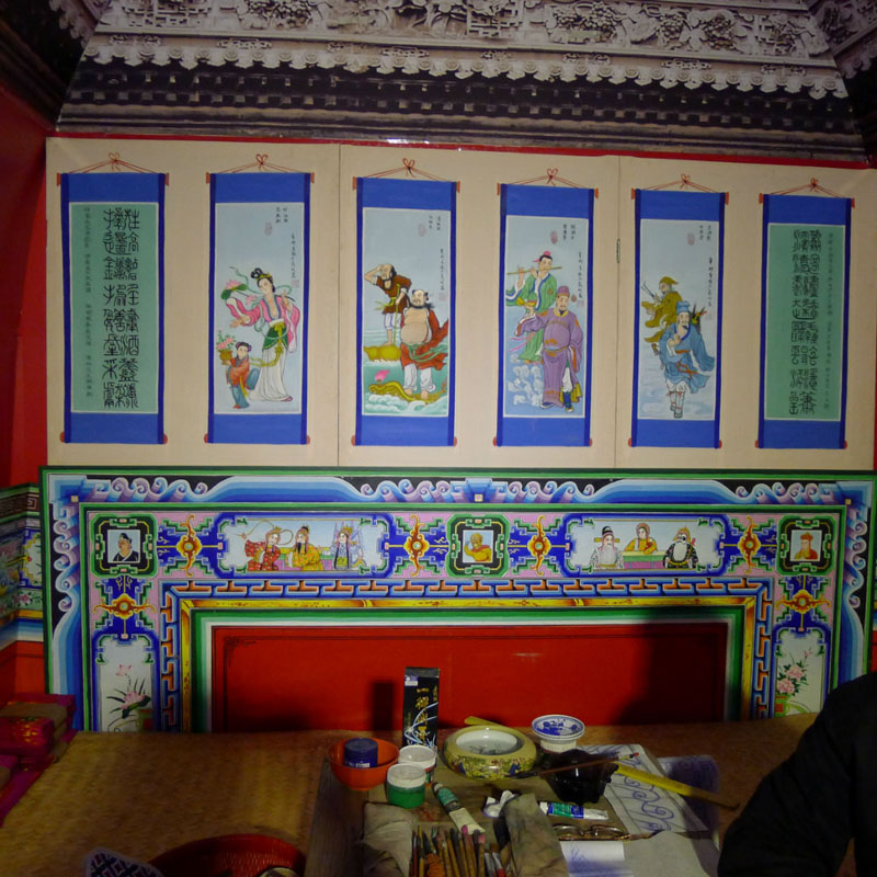 炕围画画空、边道以外的空间部分所涂色彩称为底。宁武、五寨一带喜用红棕色,红火浓艳,强烈醒目,原平、代县、繁峙一带则多用深浅绿色,素雅大方,清新悦目。二者各具其妙,各悦所好。