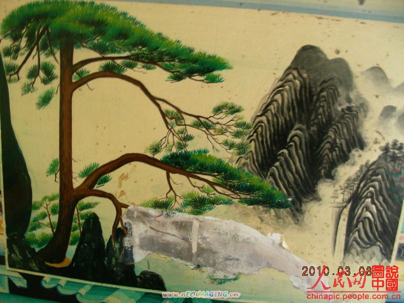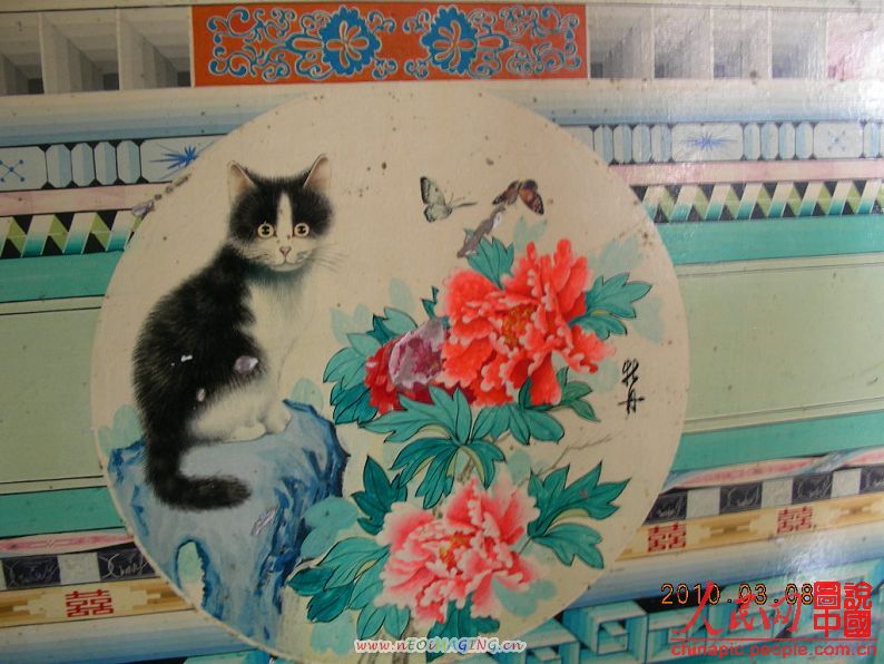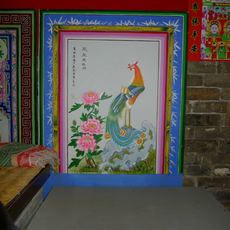 然而“重头戏”还属锅台画和看墙画。锅台上方的称为锅台画,无锅台处则为看墙画。由于其面积大,位置显,因而使得匠人总是把最拿手的本事,用在此处显露。内容多吉祥喜庆,如娃娃坐莲花为“连生贵子”,锦鸡与花是“锦上添花”,猫与牡丹蝴蝶组合为“耄耋富贵”,鹿鹤相聚则是“六合同春”,松竹梅一处为“岁寒三友”,花瓶中插月季花则是“四季平安”。