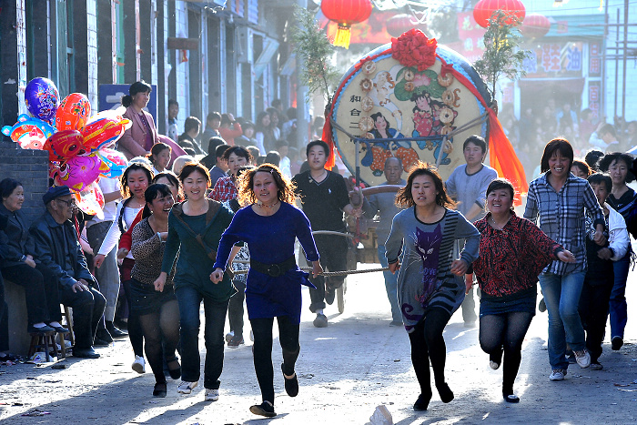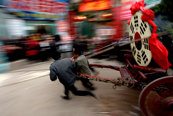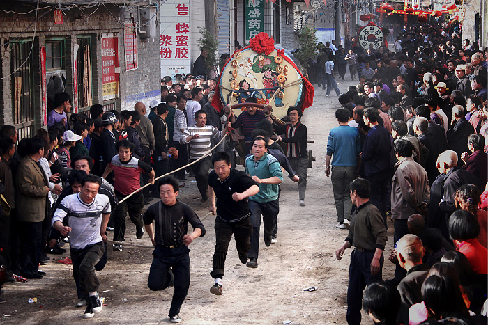 跑鼓车乍一看,都是人拉车而追逐,其实只要你细细观来,其中还真有些不同的地方。就说膏腴那块的跑鼓车吧,通过不断的演变,已经非常贴近现实生活。古拙的木轮大车,三十辐共一毂,如小蘑菇伞般的铁钉,把片片铁条牢牢地钉在木轮的外沿,使木轮显得虽笨拙却结实。在这坚实木轮所支撑的车上,前后各竖着固定的两面大鼓,向外的鼓面上,画着虎头龙首,喻含龙虎精神之意,同时还贴着用红纸写的队伍名称或村子名,也有一些鼓劲和祝愿的话。竖起的大鼓中间站着的三人,两人分擂前后鼓,以壮士气,另一人则手持大锣,以待鸣金收兵,彪悍的汉子拉着用麻拧成的粗而长的绳子,在鼓声的激励下奔驰。各队为了鼓舞士气,还请出他们尊敬的人“踩鼓车”。而踩了鼓车的人,自然也得拿出红包意思意思。但是,并不一定有钱就有资格踩辕。尤其在清明时节,踏青的少男少女,老人小孩涌集而至,在循环的路旁人潮中,各为自己的鼓车队呐喊鼓劲。更有趣的是,南北贾岗与南北膏腴交叉结队。当表演者与观看者相互感染、达到激情飞跃之际,观看人群中的北贾岗者,就会自动地参加到南膏腴的表演队中。而南贾岗的观看者,也会主动地参加到北膏腴的表演队中。拉鼓车的队伍不停地狂奔,旁边的人不断的替换,直到分出胜负为止。