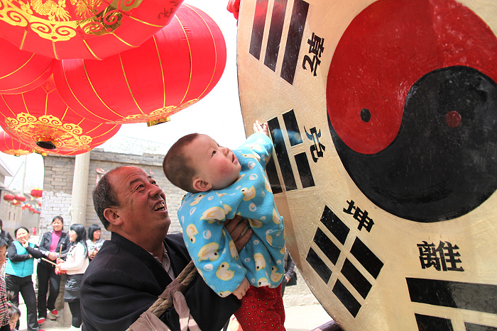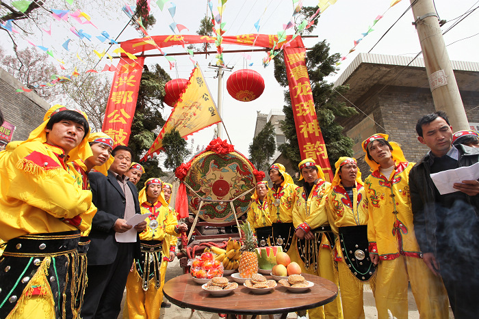 尉村的跑鼓车,却更多地能够寻觅出占时战事的轨迹。其村分为五院,各院都有自己的鼓车。这些鼓车上的图饰各不相同,仍有古代的战车布阵演化过来的痕迹。贾德亮先生《尉村鼓车文化的由来》记述:“北边的鼓,边子是黑色的;庙巷的鼓,边子是白色的;南院的鼓,边子是红色的;东院的鼓,边子是绿色的;唯独后院的鼓,边子是黄色的,鼓心还画着‘八卦图’。”这是因为其中隐含着古代易学的原理,由八卦方位、五色五行相配所致。“夏朝的‘易经’叫‘连山易’,由艮卦领先,东北为艮,所以位于东北方的后院,独画八卦于其鼓”。唐时尉迟恭驻扎占太平,承接了古晋国鄂公之地?而封为“鄂国公”。他在此击鼓训兵校练,对后来的鼓车文化产生了更加直接的影响。以至于发展到了赋予更加多的内容,驱邪去病,强身健体,祈雨求福等等。据说,清·道光年间的一个三月初六,有人说是膏腴村的鼓车比赛,也有人说是尉村进行鼓车比赛,时间久远也许是联队比赛。前队的鼓车拉着奔向南去,后队的鼓车毫不服输,也紧跟着追来。两队的后勤服务也尾随其后,你追我赶,一直拉着鼓车跑到了河南洛阳的白马寺。说来也巧,久旱的天竟下起了大雨,比赛的鼓车队也没了资金,只得将鼓车捐于官府,得官府资助而返。后来当地官方将太平鼓车置于关帝庙,每逢岁旱之时则祭鼓祈雨。此事已成了太平鼓车文化中的一段佳话。有诗作记:双车争雄去如蛟龙那年曾拉到洛阳白马寺;一鼓作气来似雷霆此日尤难忘大唐尉迟恭。
