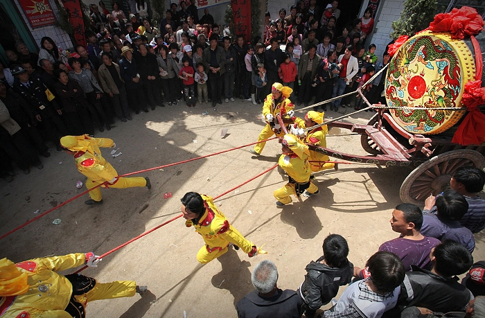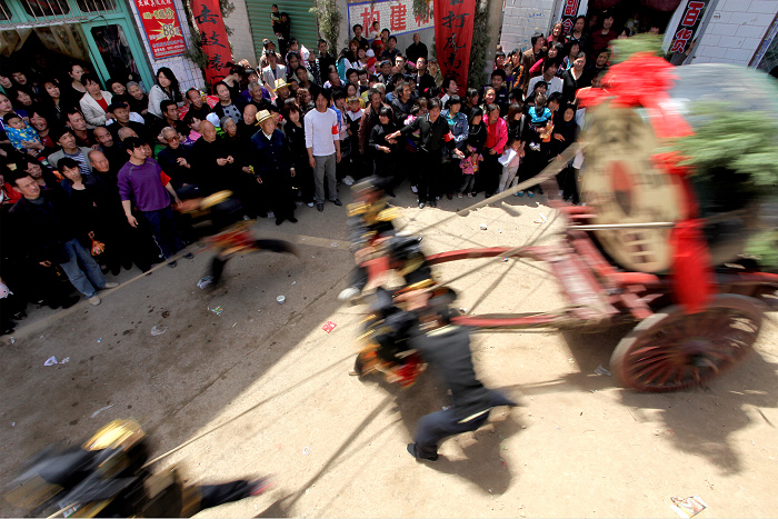 当年“鄂公”驻扎在这里“兵农合一”的军队,屯兵战备,擂鼓驱车进行军事训练和演习。悠悠岁月,在历史演进的过程中,虽然战争总是被和平不断的取代,屯兵之处的兵也早已成了民,可是擂鼓驱车的军事训练,却被积淀成了团结合作、拼搏向上的一种赛事,成为当地独特的跑鼓车文化。