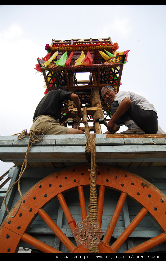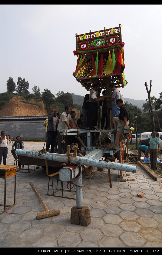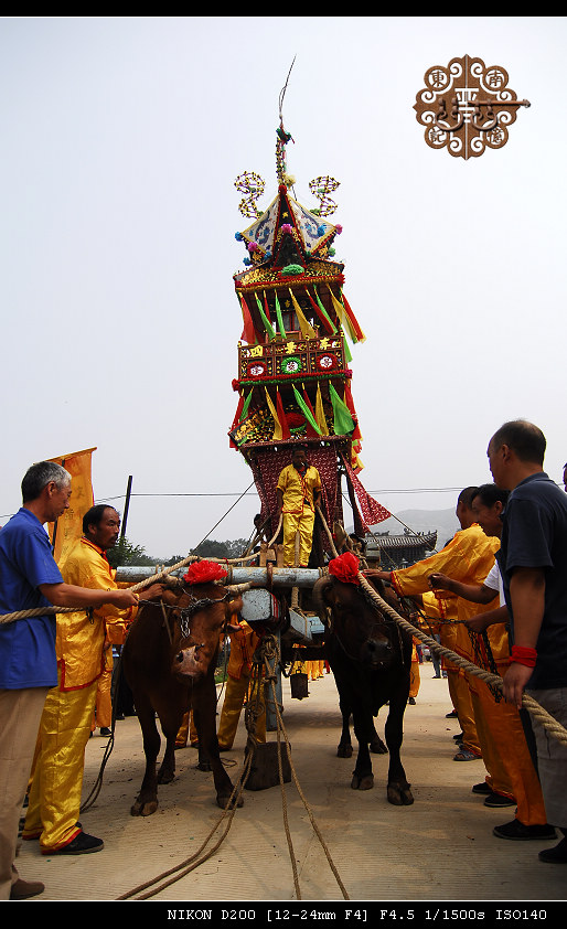 四景车真正再次与世人见面,是2005年农历四月初四,中断了66年的九天圣母庙大赛会复会。一根独木巨辕横贯整个车体,两个木质车轮支撑全车重量,三层木质构架似轿如楼,四头肥壮健牛承驾辕头,百名驾车能手紧随车身前后。远看四景车如移动的宫殿,富丽堂皇,巍峨壮观;走近观看,四景车如精致阁楼,红黄绿蓝彩绸装饰,五彩之色彩纸点缀,扎制工艺精巧逼真,雉翎高插气宇轩昂。那场景叫一个气派:四面铜锣开道,回避肃静牌立,四象旗迎风飘扬,四景车浩浩荡荡威严无比。四乡八村,万家落锁耄耋孺子,竟相观看,好一幅国泰民安、盛世太平的风俗图。