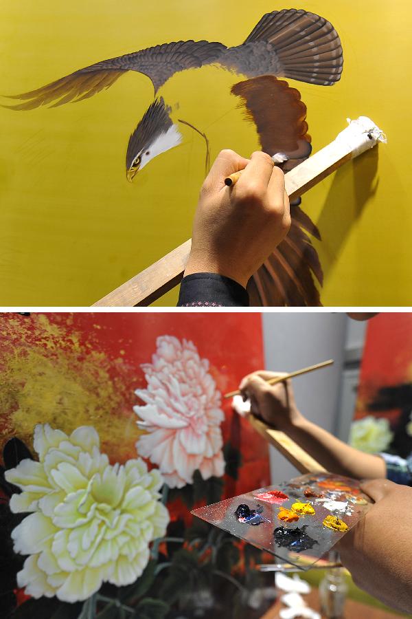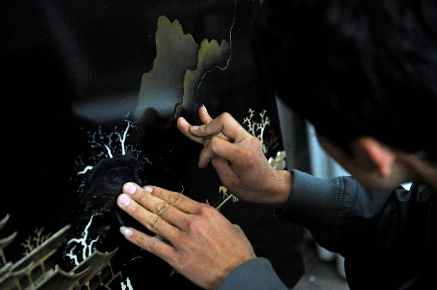 平遥漆艺传承人薛生金的弟子张勇兴用手抹匀漆画上的颜色 |