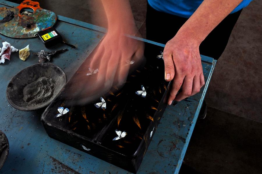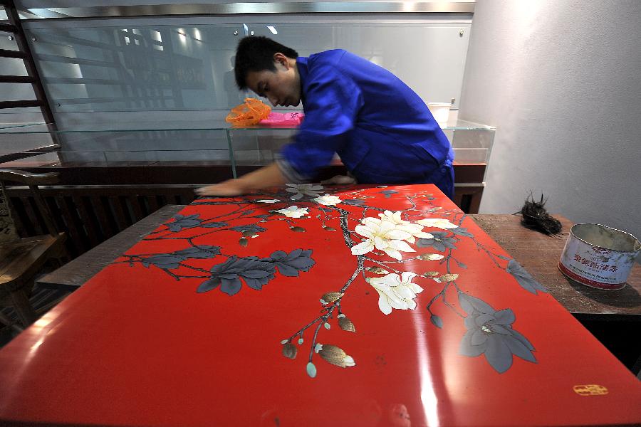 2012年9月25日,平遥漆艺传承人薛生金的弟子雷幸超用手抹上麻油、砖灰,给漆器“推光”