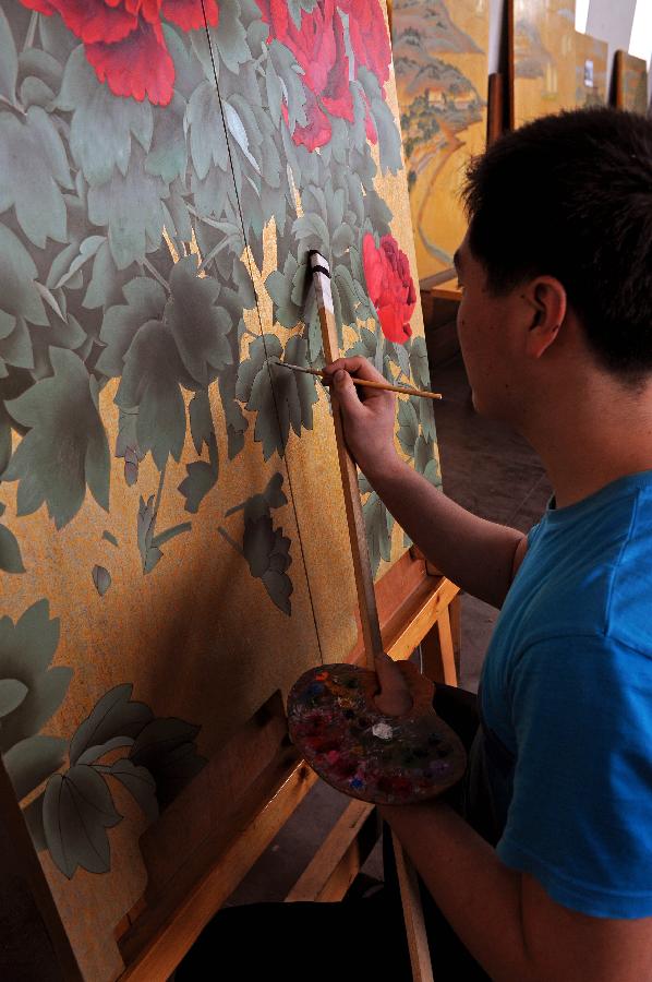平遥漆艺传承人薛生金的弟子雷幸超为一幅漆画上色