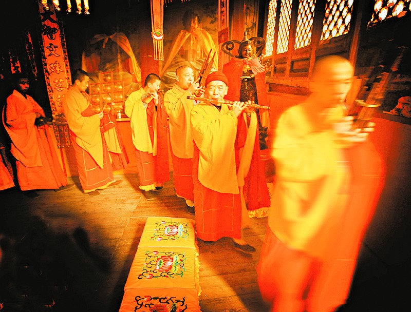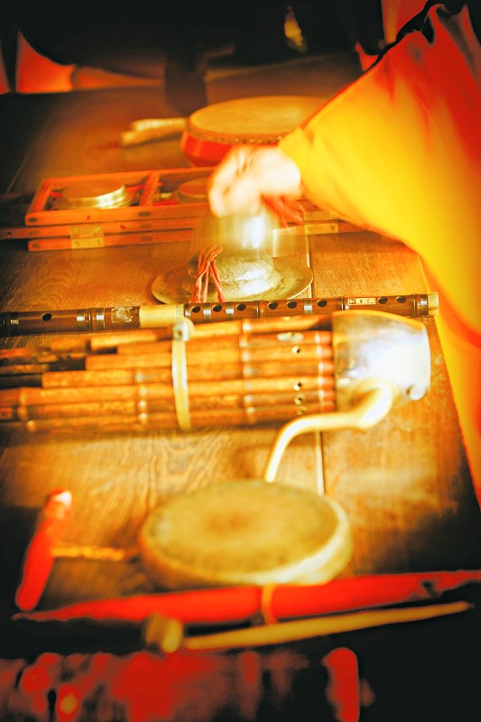 中国的佛教音乐分为南北两派,南方佛乐以委婉、清秀为特点;北方佛乐则深受古印度音乐的影响,呈现古朴、典雅、庄重和肃穆的特点。 五台山是全国惟一兼有汉传佛教和藏传佛教的佛教圣地。佛教音乐与五台山佛教相伴,是五台山佛教文化的重要组成部分。演变作为北方佛乐的代表,五台山佛乐与五台山佛教同生共荣。 五台山佛乐源于印度佛教音乐。唐代,由于佛教仪式的日益集体化、规范化,五台山佛乐达到繁盛,形成独唱、齐唱、轮唱等多种演唱形式。 元末明初,乐器被引入五台山佛教,除为经文诵咏伴奏外,还要演奏乐曲,使五台山佛教仪式的艺术性得到很大提升。到了明代,五台山佛乐又有新的发展,进一步吸收了唐宋曲牌、元杂剧曲牌以及民歌、民间乐曲等的特点。清康熙以来,由于统治者特别青睐藏传佛教—— 喇嘛教,五台山佛教音乐中便又出现了黄教音乐。 目前,僧人掌握了演奏技巧的五台山佛乐有20多首,在法事活动中常用的有《华严会》、《普庵咒》、《千声佛》等。 随着时代的发展和变迁,五台山佛乐也在发生着变化。新一代僧人已开始学习简谱和西方的乐理。同时,一些新编的佛乐则采纳了不少当代流行歌曲的乐谱。一些香客认为,这样的佛乐更易上口,也容易深入人心。分类 五台山佛教音乐,分为经文音乐和经外音乐两部分。 经文音乐是专门用于佛事活动的音乐,由经文与佛曲相融而成。没有乐器伴奏的称“咏读”或“念高调”,有乐器伴奏、以歌赞为主的称为“梵呗”或“合念”。经文音乐主要有四种形式:一种是带有乐器和法器伴奏的唱经,僧人们称其为“和(音格)念”;第二种是不带伴奏、只用法器击节的唱经,僧人们称其为“令调”;第三种是有简单旋律线条的“吟诵”;第四种是以语言自然音调为基础、和着木鱼敲击节奏的“诵经”,僧人们称其为“直数”。 经外音乐没有词、偈,仅有以乐器演奏为主的器乐曲牌,是五台山庙堂音乐的精华。 传承 五台山佛教音乐的传承方式是传统的口传心授。学习时,徒弟首先要把乐器上每个字的位置记牢,然后学习唱谱。学习唱谱时,师傅首先依照工尺谱(中国民间传统记谱法之一,因用工、尺等字记写唱名而得名)所提供的曲调框架,按照自己的理解或是个人的爱好和习惯,依据板眼一句一句施教,待徒弟唱会并背下来之后,再拿乐器依字找音(俗称“捏眼”),慢慢奏出旋律。每一首乐曲的每一句都需要这样去教。所以,如果没有师傅的传授,徒弟仅有乐谱也是唱不出曲调的。这种教授方式,使每一首乐曲旋律由于师傅的不同而产生些微的差异,,同时,也形成了相同曲调有多种不同唱法的现象,使乐曲显得非常丰富。但是,无论怎样变化,曲调的基本风格不会变。五台山僧人在点笙(调音)方面有独特的技艺。 但是,五台山佛乐的不断萎缩十分令人担忧,主要表现在以下几个方面。一是,以前,五台山的一个寺院就可以组织起若干僧人组成一支相当规模的乐队来演奏佛曲,但是现在一个寺院如果想要做一次传统佛事,需要由几个寺院共同凑人,才能组成一支小规模的乐队。二是,在一部清宣统二年曲谱的抄本中,记有曲调200多首,而目前青、黄庙恢复的曲目仅二三十首。造成这种现状的主要原因是传承的困难。目前,五台山上会佛乐的僧人不过50余位。培养一个能演奏乐器并会唱经的僧人要几年甚至十几年的时间,而训练班里的僧人流动性很强 。继承五台山佛乐文化遗产,需要一份恒心。如何更好地传承这份文化遗产,是一个刻不容缓的课题。 ■