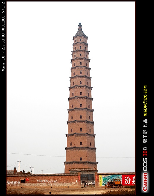 于是,我们从太原驱车直奔汾阳,并在好友的陪同、导游下,来到位于汾阳城东2公里处的建昌村附近“文湖广场”上的汾阳文峰塔下,这就是中国第一古塔了,其“中国之最”就“最”在其维修后84.93米(原高度为80.12米)的高度,在中国古代砖塔中是位列第一的,因此而成为了“国家级重点保护文物”。