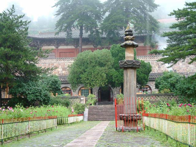 从大雄宝殿出来后,文管员指着殿前立着的一座青石经幢说:“这是唐代中11年10月大殿落成后施主宁公遇立的,上面刻着的名字至今依然可辨。接着他又带着我们来到大难宝殿南侧的一座高约6米的六角双层楼阁式砖塔前,介绍道:“这是孝文帝时期本寺开山祖师墓塔,塔内供有祥宗的无名、慧明两位祖师塑像,是国内仅存的两座北魏古塔之一。另外,寺外东坡上还有7座砖塔,其中一座是大德方便和尚塔,是唐贞之11年建的,比大雄宝殿还早了70多年呢!”