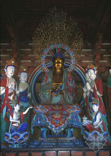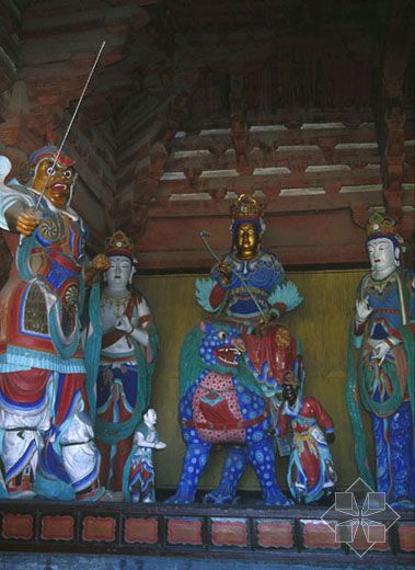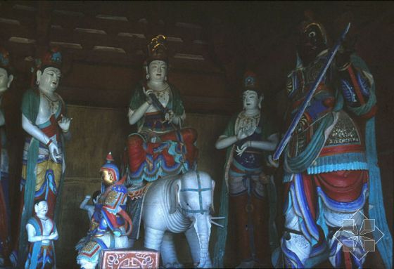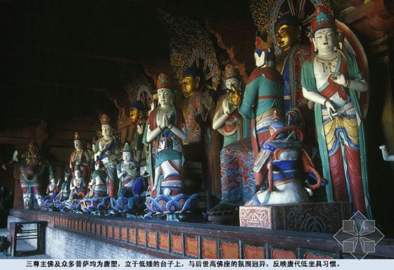 “佛坛长有5间房,宽有1间半,是五台山最大的佛坛,上面供养着35尊塑像,都是唐代的,正中间趺坐在须弥座上的是释迦牟尼佛,阿弥陀佛居右,弥勒佛居左,膝侧为大弟子迦叶和阿难,前两侧站着的是胁侍菩萨,胁侍菩萨前面是两尊供养菩萨,再左边是骑象的普贤菩萨,再右边骑狮子的是文殊菩萨。你们看:佛坛南侧那尊不太高,端坐于坛边,衣着打扮文雅富贵,但与佛、菩萨等的衣饰有着明显区别的塑像,就是当年这座大殿施主宁公遇。”文管员依次给我们介绍着,又带着我们到佛座背面指着一幅色泽犹新,画面上站着一个头戴花冠、神情恐慌的女子,长约80厘米,高约30厘米的壁画,说:“这是唐代的壁画,画的是天王降伏妖魔鬼怪的故事。大殿两侧供台上的500尊罗汉实际上只有245尊,都是明代宣德5年补塑的……”
