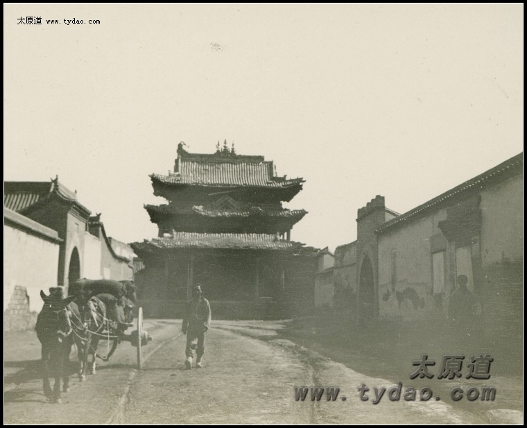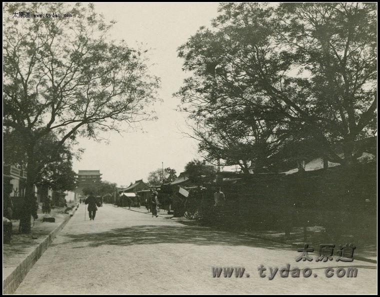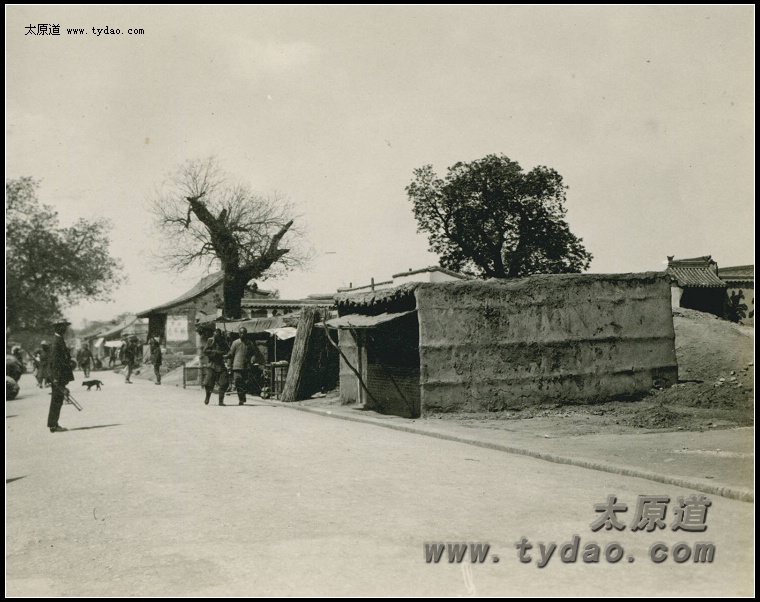 注释:只有枯藤老树昏鸦,而无小桥流水人家,一幅太原清末的街景呈现在我们面前,老槐树,泥土房,无不透露着山西气息。在照片左边有位西服革履戴礼貌的人,很有可能就是张柏林的同行者吧。 |