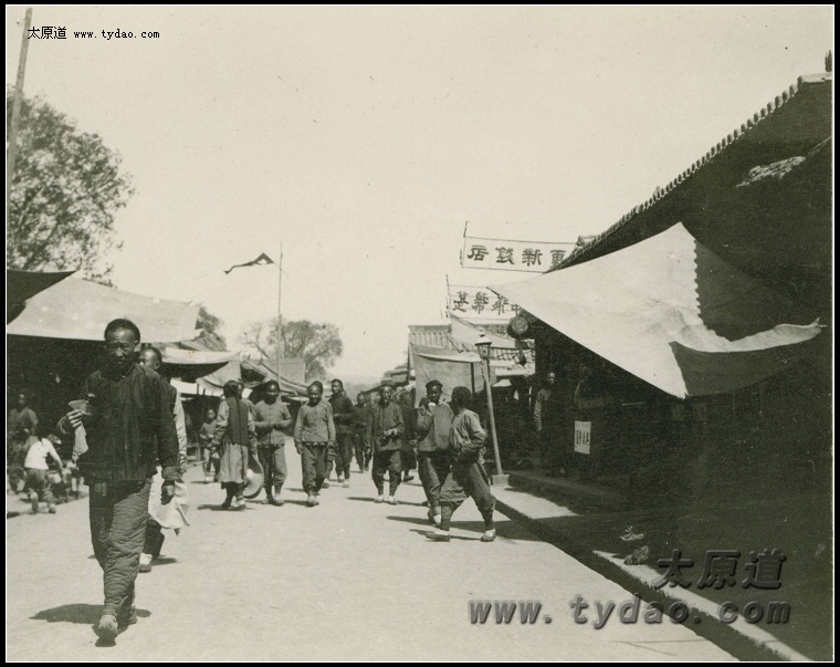 注释:熙熙攘攘的人群,右边清晰可见的“更新钱店”“兑换”“中外”等招牌,展现了20世纪初太原的银行业风貌。 |