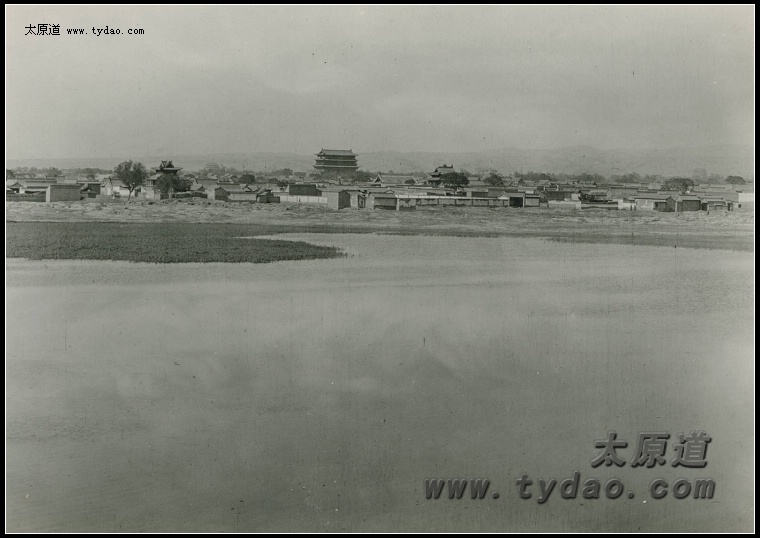 注释:这张照片的信息最丰富,经仔细辨认,这是拍摄者站在迎泽门西边的城墙上向城内拍摄,近处的大滩水域正是南海子,中间最高大的建筑为鼓楼,鼓楼左边的突出的阁楼正是水西门街与西米市交叉口的四神阁。而在照片远处依稀可以看到大东门和小东门。 |