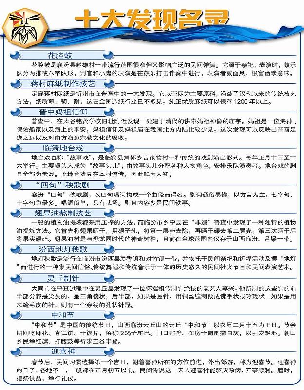 在今年年初北京举行的“非遗”展示大会上,山西“非遗”成果的“生产性保护”做法被中央认可。而这些经验,大都是从本次“非遗”普查的实际经验中来的。