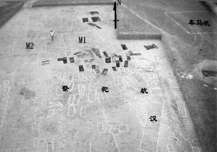 发掘工作一旦进入程序便有条不紊的进行。我们按照通常的田野考古操作规程,采用大面积布方、分块下挖、统一暴露的程序,当墓口、墓道全部暴露在我们的视线下时,我们惊呆了,在M1、M2的墓室南部和南墓道上,有大规模的祭祀遗迹,祭祀坑间多有打破关系,其复杂的程度让人眼花缭乱。