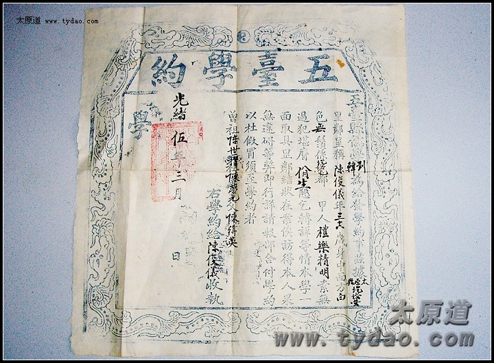 这是一件清光绪五年山西五台县儒学颁发的“五台学约”,内文如下:“五台县儒学刘、韩为给发学约事,兹据太原县圪塔营里邻呈称:陈俊仪,年三十六岁,身中、面方、白色、无须,系圪塔屯都