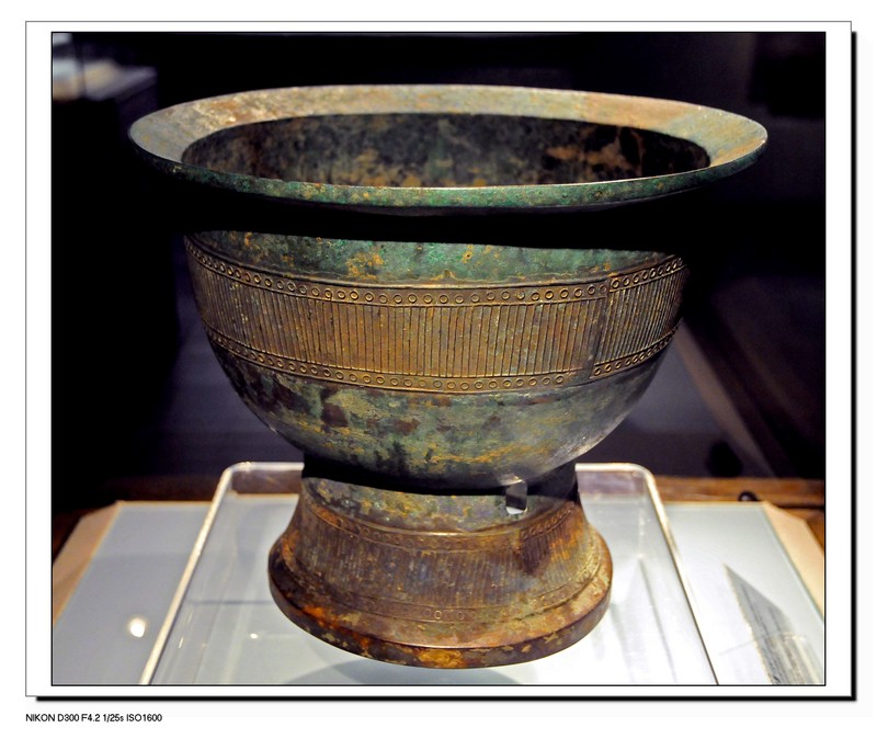 山西博物院“夏商踪迹”展厅展出着一件商代青铜直线纹簋,它通高27.3厘米,口径33.2厘米,底径20.2厘米,1959年出土于山西省石楼县桃花庄。这件簋为敞口,宽外折沿,弧壁深腹,底部圆收近平,下接喇叭形高圈足,圈足上部有长方形镂孔三个,腹部和圈足各饰以一周直线纹带,上下框以圈连接。商代的青铜器一般都有其固定的纹饰,常表现为饕餮纹、兽面纹等,像这样的饰以直线纹的簋,在我国的陕西省等地虽也有发现,但总的来说还是非常罕见的,有的学者据此提出商代我国文化即与西方文化有一定关联,尚需考证,但这件青铜直线纹簋的重要意义已是自不待言。