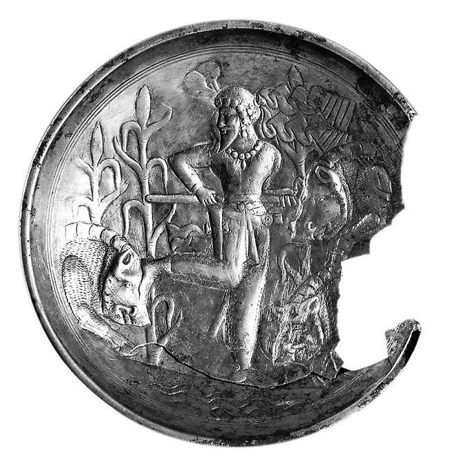 北魏王朝是中国历史上不可缺失的一环,在它的存在期间,中国本土和外来的宗教、艺术、思想、文化发生了剧烈的冲突和前所未有的融合,可以说,北魏时期奠定的中华文化海纳百川的基调直接影响了此后的中国历史和中国文化精神。大同作为北魏的都城曾经将近百年,史称“北魏平城时代”,在这里,留下了丰厚的文化遗留。现藏于山西博物院“民族熔炉”展厅的这件北魏狩猎纹银鎏金盘,1981年9月出土于大同市西郊小站村花圪塔台北魏封和突墓,是一件典型的波斯萨珊器物。这件银鎏金盘高4.1厘米,口径18厘米,圈足直径4.5厘米,高1.4厘米。盘内沿有旋纹三道,中刻狩猎图,图中人像深目高鼻牞连腮长髯,面颊清瘦,目光宁谧牞有人推测为萨珊朝第四代国王巴赫拉姆一世(273~276)。人像头戴半弧形冠,边缘缀以联珠,顶端有一突起的角状饰,脑后有飘带两道,耳饰水滴形垂珠,颈饰圆珠项链,腕上戴由圆珠组缀的手镯,革带上也缀两颗圆珠,身着紧身便服,腰右侧佩箭筒,足穿半长统靴,人像正徒步行猎,两手执矛,刺入野猪头部,身旁又有两头野猪从芦苇中窜出。其构图具有典型的波斯萨珊王朝艺术风格。萨珊朝金银器皿流传至今的不多,收藏在苏联的约有90件,英国、法国、日本、波兰、印度等国各收藏寥寥数件,而且大多数系传世品。波斯封和突墓银盘在中国是首次发现,且年代明确,所以对研究萨珊金属工艺史及中国与伊朗文化交流史都是极珍贵的资料。 ■ |