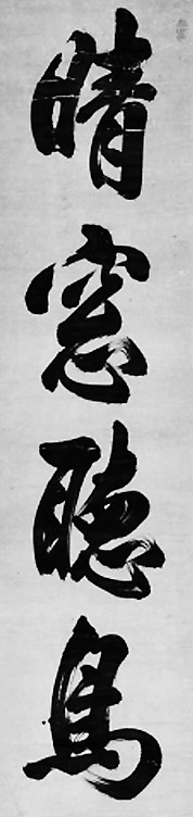 杨二酉是清代山西又一书法大家,他的书法作品意境高迈,天趣流动,以颜真卿笔法为基调,参以二王笔意,深沉中极备灵动之致,凝炼雄浑,意态雍容,具见其非凡的功力。现展出于山西博物院“山右清风——山西清代名家书画展”的杨二酉书法,有一套气魄非凡、极其精彩的杨二酉行书《后赤壁赋》十二条屏,限于篇幅,这里介绍他的另一套作品——杨二酉行书联。这套对联为纸本,每幅画心高173厘米,宽46厘米,上联书“晴窗听鸟”,下联书“夜月锄花”,落款“悔翁二酉”,笔力遒劲,气势雄浑,极见功力,是杨二酉传世不多的真书墨宝。