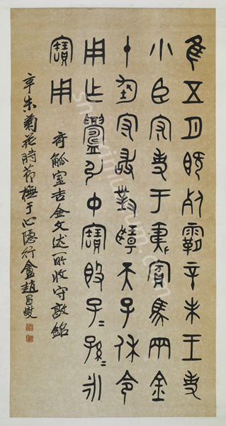 昌 燮(1877-1945),字铁山、惕山、铁栅,号汉痴。晚年号柴翁、心隐庵主人等,山西太谷人。赵昌燮在经史、书画、文学方面均有极深造诣。在他19岁时,书法已著称乡里。宣统元年(1909),中国近代史上最后一次科举取士,赵昌燮得选拔贡。辛亥后,他深居简出,精研书画,临习诸家,兼教子侄辈课读。他的书法造诣极深,初致力碑学,晚年又深研帖学。书法由唐上溯汉魏六朝,凡名家碑版,无不求索临池。篆、隶、真、行,四体皆精,书路之宽,为一般书家所不及。民国十五年(1926),他的书法在上海展出,被誉为“大江以北,无出其右”。赵昌燮与榆次常赞春、旭春兄弟,书风复古,直追秦汉,创造了民国山西书法史的又一高峰。现展出于山西博物院“山右清风——山西清代名家书画展”的赵铁山书法作品,几乎涵盖所有书体,足见其人学问、书道之渊奥。其中久享盛名的赵昌燮金文临《小臣守簋盖铭》轴尤为引人注目。这幅作品为纸本,画心高1.4米,宽0.7米,为赵氏临摹青铜名器小臣守簋的盖内铭文,书写古奥中蕴含变化,沟通了数千年中国书法史,以此观之,赵铁山不愧一代大家! ■ |