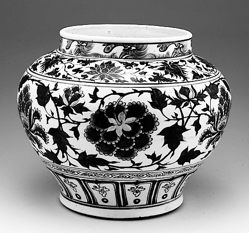元青花瓷器造型大气雄浑、青花幽靓富丽、画风潇洒豪放,不仅具有使用和装饰价值,而且具有极高的审美情趣,凝聚着东方文化和艺术的魅力,成为最具民族文化风格的重要彩瓷品种,深受海内外世人的青睐,是中国陶瓷史上的一朵奇葩,元青花的烧造成功也使景德镇一跃成为中世纪世界制瓷业的中心。山西博物院收藏的一件元青花缠枝牡丹纹罐,高28厘米,口径20.9厘米,底径20.4厘米。直口、短颈、广肩、鼓腹,腹以下渐收至底边微外撇,平底、矮圈足。这件青花缠枝牡丹纹罐胎体厚重,体形硕大。胎骨较白,稍含灰,手感沉重,致密坚硬,通体绘花纹五层。颈部为姜牙海水纹,肩部饰以七朵缠枝莲花,罐中部以六朵缠枝牡丹为主体纹饰,其中三朵牡丹花为侧立状,两朵正面和一朵朝下露蒂的牡丹花穿插其间,仰覆相间,正反缠结,栩栩如生。足部饰变形莲瓣纹,主题纹饰与足部纹饰之间饰以卷草纹,各层纹饰以双弦纹相隔,既突出了主题图案,又增加了画面的层次感。画笔流畅,图案装饰繁而不乱,是元代青花瓷中不可多得的精品。近年来元青花价格在国际拍卖品市场上屡创新高,成为深受国内外收藏家追捧的新宠。