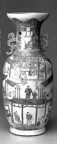 目前展出于山西博物院“瓷苑奇葩”展厅的一件清代嘉庆粉彩制瓷图瓶,恰好将古代制瓷流程立体地展现在今人面前。此瓶盘口,长颈,圆鼓腹,圈足,颈饰蟠螭形双耳,高60.3厘米,口径20.2厘米。通体彩绘,内容为清代景德镇御窑厂瓷器生产的主要过程,共有九组构图,分别为采石、淘泥、镟坯、画坯、吹釉、满窑、烧窑、彩器、烧炉九个不同的生产场面,构图丰满,所绘人物达五十人之多,除四人外,大都是直接从事生产的各种工匠。在布局上,以屋、棚等建筑为框,缀以不同的场面。用淡雅柔和的粉彩,对不同场面,各种人物的神态动作、穿着服饰、生产工具的描绘,生动具体,形象写实,笔墨简练、细腻,真实地再现了窑厂的生产情况,为我们研究清代的瓷器生产及我国制瓷业的发展提供了宝贵的资料。