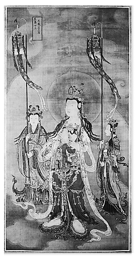 右玉县在大同市西120公里牞地势险要牞为我国古代北方军事重镇。宝宁寺位于城内鼓楼东大街牞为右玉的一大禅林,水陆画在佛历每年的农历四月初八日至初十日(浴佛日)悬挂三天牞做水陆道场,道场完毕之后牞就把画严密地收藏起来。有学者认为此套水陆画是明朝廷用于镇边的,具有安邦定国之意。抗日战争时期牞各界爱国人士有计划地把这批画运到当时的绥远。解放后牞又安全地搬运回大同,1955年山西省文物管理工作委员会又将其自大同征调到省里,现全堂水陆画都收藏于山西博物院,部分展出于“佛风遗韵”展厅。宝宁寺明代水陆画,绘制精美绝伦,有学者认为是由明代的宫廷画家所绘,整堂画作无论是笔法、着色、制式及规模,无不体现了高超的工艺和画技,故这堂水陆画的价值堪称中国现存水陆画中的极品之一,其中,佛、菩萨、明王及各路天人宝相庄严,令人起敬,其中“天藏菩萨”一幅,正中绘天藏菩萨,双手合十,袒胸跣足,飘带长裙,璎珞披体,立于青莲之上,两旁侍女羽衣飘带,执幡站立,颇具虔诚之态,整幅描绘细致入微,人物线条流畅柔和,显现出一派雍和法相。