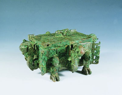 这件器物出土于山西省曲沃县北赵村晋侯墓地63号墓,它高9.3厘米,长19.2厘米。器作长方形方盒,器形为晋国铜器所常见,但此器极富装饰艺术性。顶部有两扇可以开启的小盖,其中一个盖子上饰有卧虎形钮。方盒四面各攀爬着一条回首吐舌的大龙形耳,四隅有勾曲形棱脊。方盒以四个裸身跽坐(古代的一种坐姿,大致为两膝跪在地上,臂部坐在小腿肚上)的人形为足,其背对方盒,双手后摆,背负手抬以承其重量。盖面饰两头龙纹,四周围有箭镞形几何纹。盒壁饰变形兽体纹,下为波曲纹。器身布满绿锈和水银古,斑驳陆离,交相辉映,仿佛见证着历史的沧桑。这种青铜方盒,过去被误称之为鼎形方盒,其实这类器物除了器底有四足外,与鼎类器毫不相干,其功用更是不得而知。近些年考古发掘出土同类器物表明,青铜方盒应该是女性用来盛放饰件或珍藏小型物件如首饰一类的。这件器物在年代上早于著名的国宝刖人守囿车,而工艺却各有千秋,都是晋国青铜器中的精致之作。